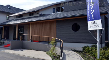 テーマ:和風住宅に似合う庭 ≪住宅展示場≫侘びを感じる庭 和風タイプ 日本ハウスホールディングス(株)ナゴヤハウジングセンター一宮展示場 ポーチ300×600タイル貼り コンクリート洗い出し仕上げ 手すり 化粧砂利敷き ジョリパット塗り壁 垂れ幕ポール 住宅展示場
