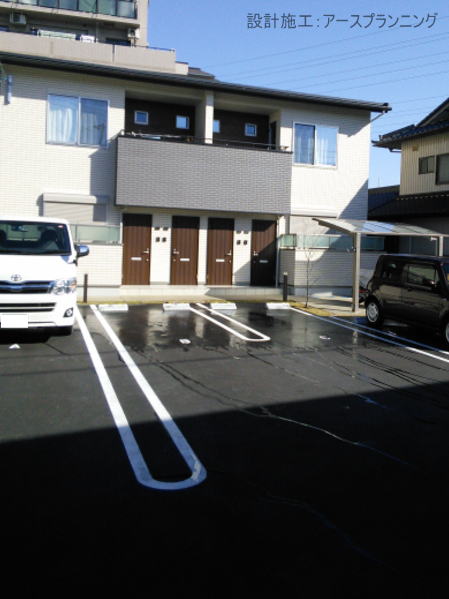 テーマ:草花がナチュラル感のあるデザイン ≪アパート≫洋風タイプ コンクリートブロック積 塗料塗り壁仕上げ アプローチコンクリート洗い出し アスファルト舗装密粒 アスファルト舗装透水 照明工事 車止め 白線ライン U字溝蓋敷設 アパート