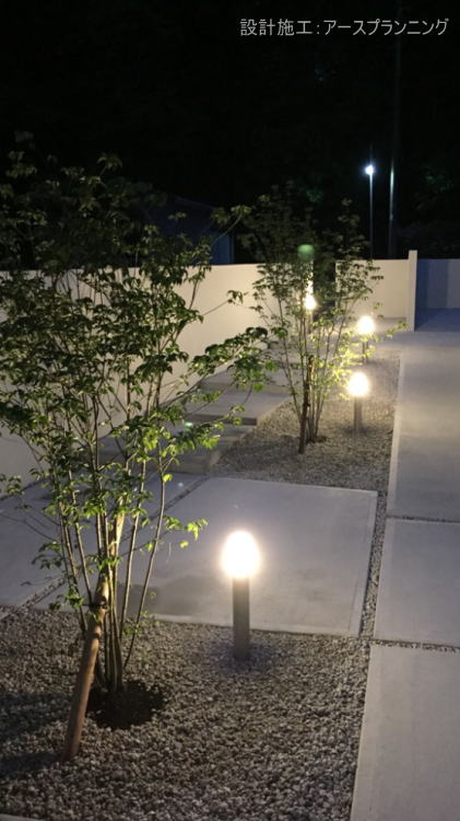 夜間照明エントランス照明を通路に3台、更に門柱を照らすエントランス照明が1台、光の道を創ります。 |
