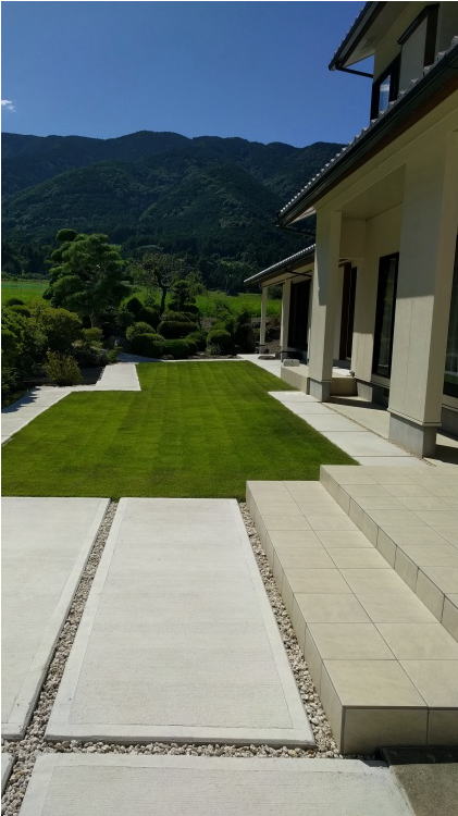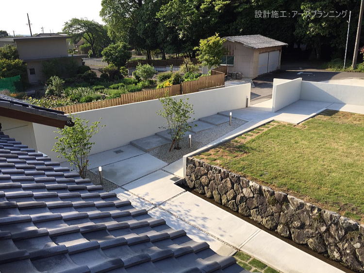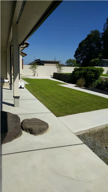 お庭雨の日による屋根からの雨水の跳ね泥れを抑える犬走りと、反対側にはコンクリート通路で芝を囲んで管理しやすい空間に、シンプルを大切にしたデザインです。 ![]() ![]() |