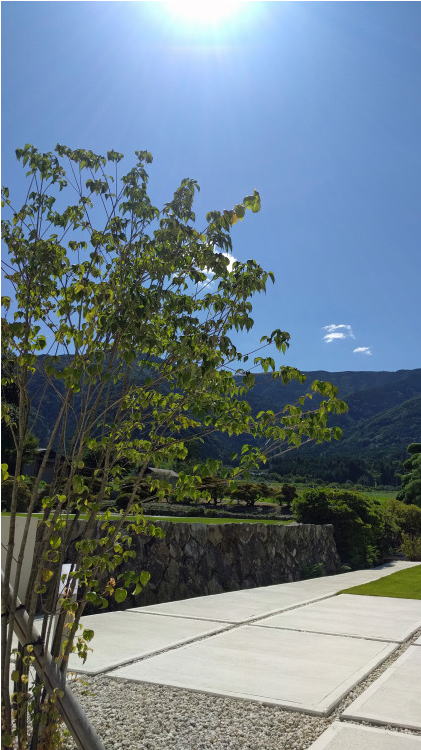 門柱から更に家の方へ進みます。玄関に近づくと存在感のあるヤマボウシの株立ちを配置し、癒しの緑に囲まれます。 ![]() |