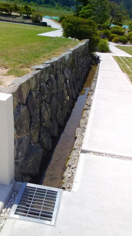 環境山から流れてきた天然水は、石組の水路に流れ込みます。夏はとても冷たく、見た目も涼しいです。